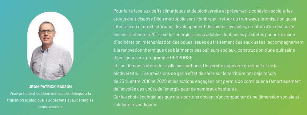 Pour le dire autrement, la question de l’énergie, mais aussi celle de la biodiversité, sont des défis majeurs qui sont appréhendés de façon transversale dans toutes nos politiques publiques : urbanisme, aménagement et usage des sols, mobilités, développement économique, alimentation, préservation des ressources, etc. Avec, pour les élus de Dijon métropole, la conviction que l’énergie est un service essentiel auquel chaque citoyen a droit, à commencer par les plus fragiles, impliquant de passer d’une vision moins technique de l’écologie dans les quartiers à une vision qui émancipe les habitants et les rend acteurs de leur territoire.